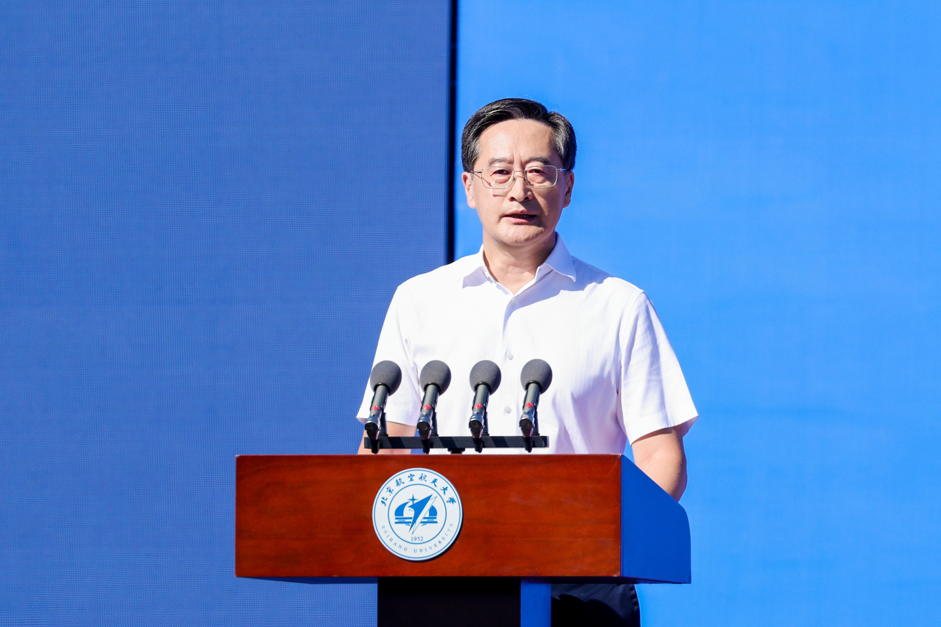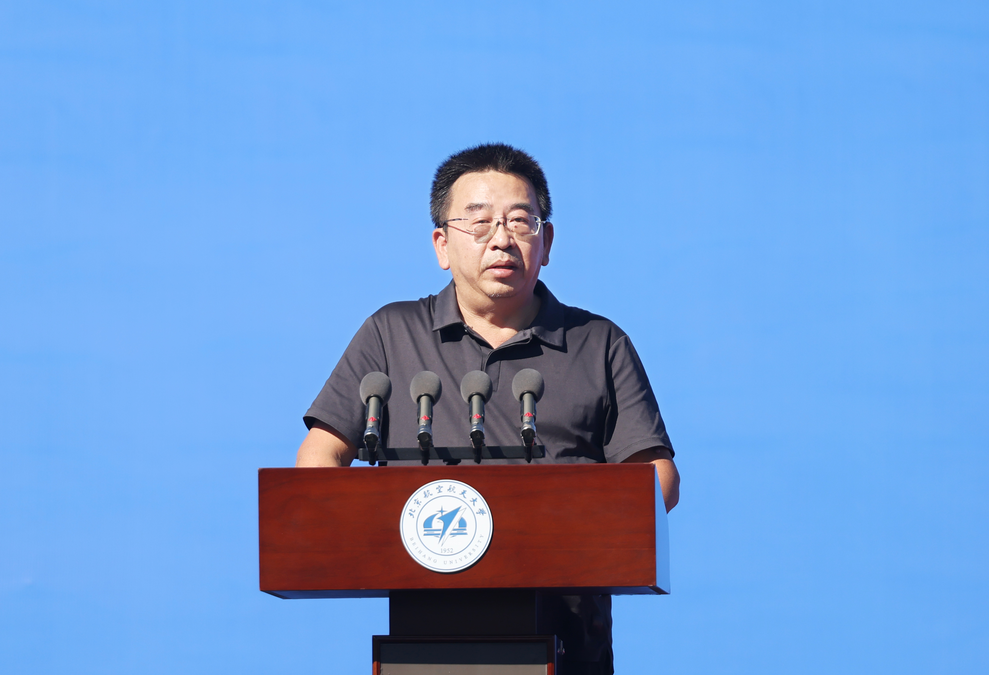 王云鹏代表北航全体师生对13708名新北航人表示热烈的欢迎和衷心的祝贺。他深情回顾了北航73年来始终与国同行、为空天事业奋斗的光荣历程,深入阐释了一代代北航人以智慧和汗水践行“空天报国”的使命担当。王云鹏指出,就在刚刚结束的九三阅兵上,众多“大国重器”背后都彰显着北航力量,这些成绩,正是北航人以智慧和汗水,为祖国空天事业书写的精彩华章。“学校的目标始终如一,就是要把优秀的你们培养成为能够开创未来、扛起国家重任的一流人才!”