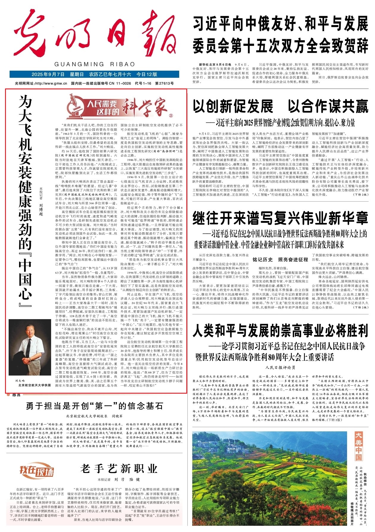 《光明日报》头版头条【人民需要这样的科学家】l栏目刊发我校刘大响院士事迹文章: