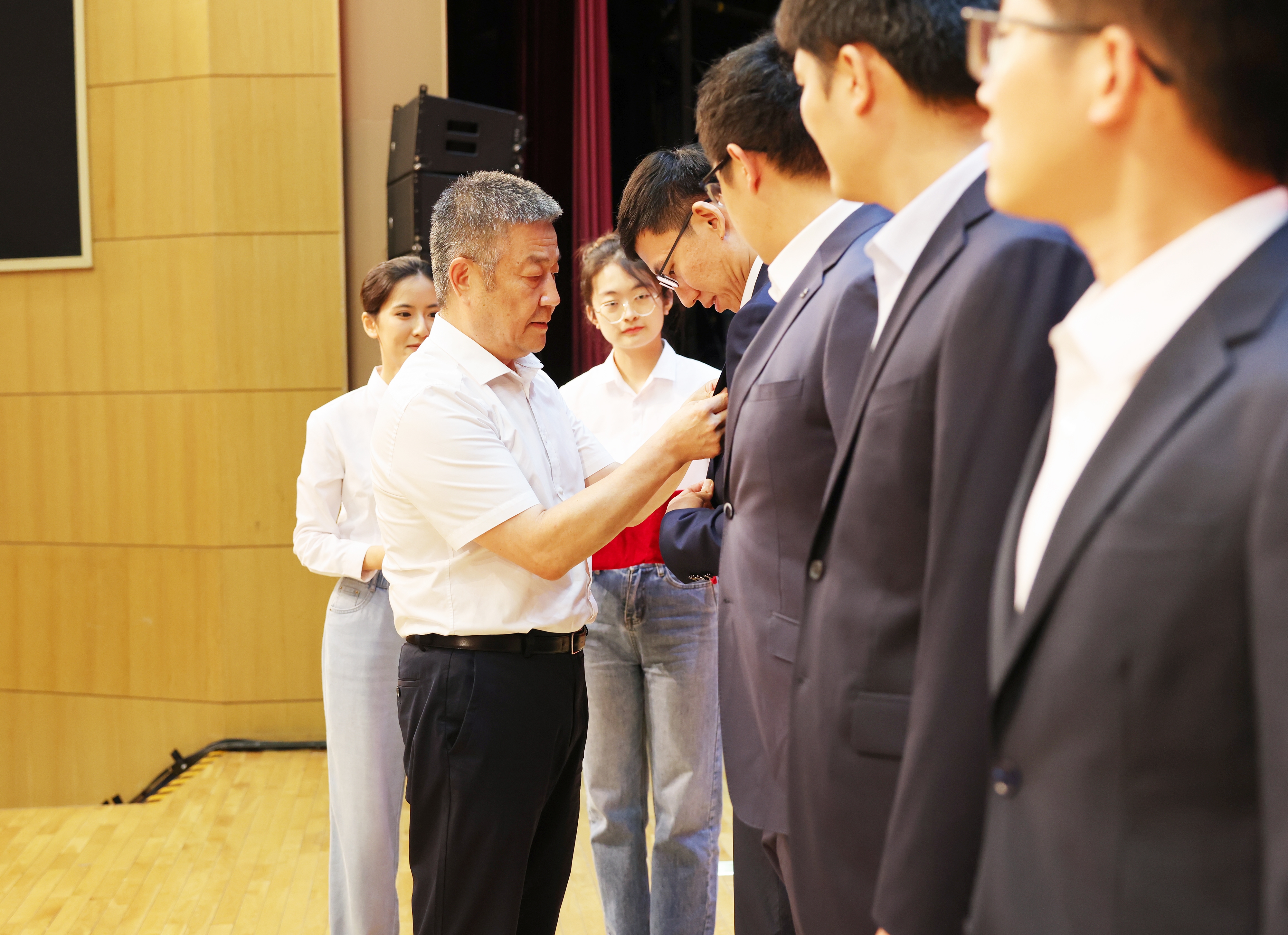 大会现场,党委书记赵长禄为新进教师代表佩戴校徽。