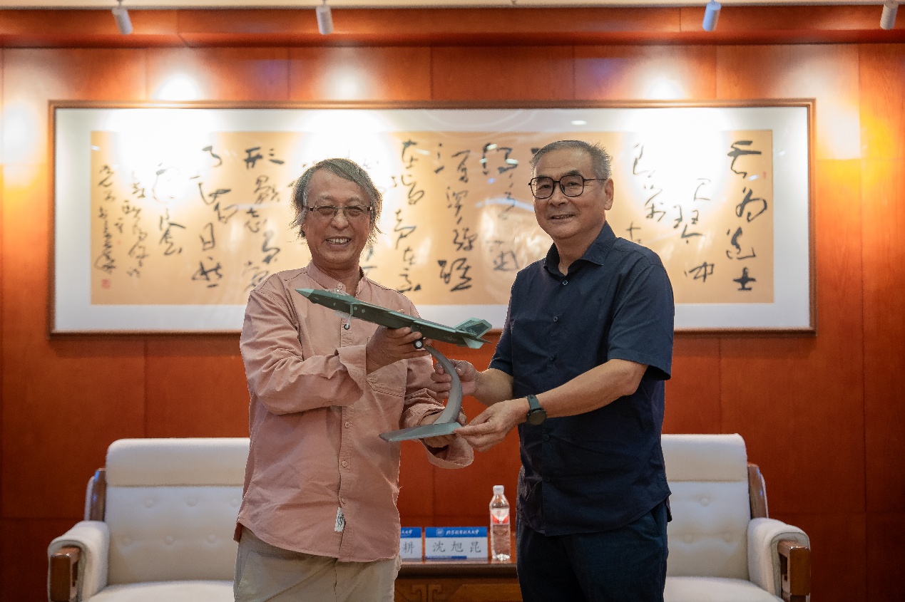 讲座开始前,美育中心主任兼新媒体艺术与设计学院院长沈旭昆等与朱乐耕亲切交流并互赠纪念品。