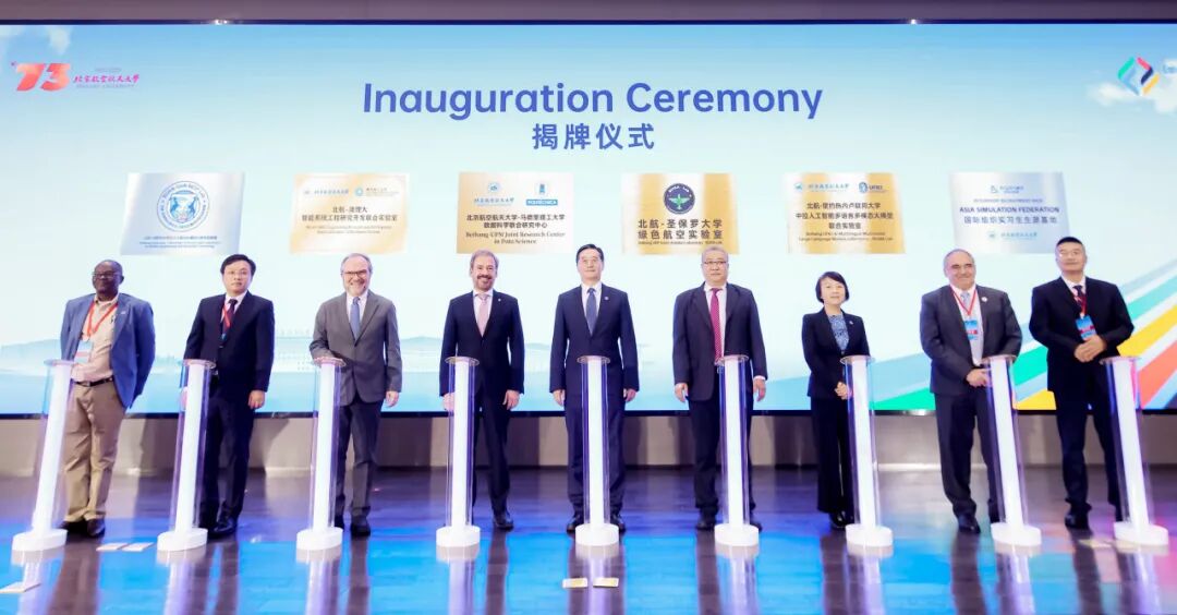 王云鹏和与会嘉宾共同为6个联合实验室揭牌,“北航-马德里理工大学数据科学联合研究中心”“北航-圣保罗大学绿色航空实验室”“中拉人工智能多语言多模态大模型联合实验室”“北航-内罗毕大学北斗工程与仿真技术联合实验室”“北航-澳门理工大学智能系统工程研究开发联合实验室”“亚洲仿真联盟国际组织实习生生源基地”等实验室将成为北航与全球伙伴共享资源、协同创新的实体平台。
