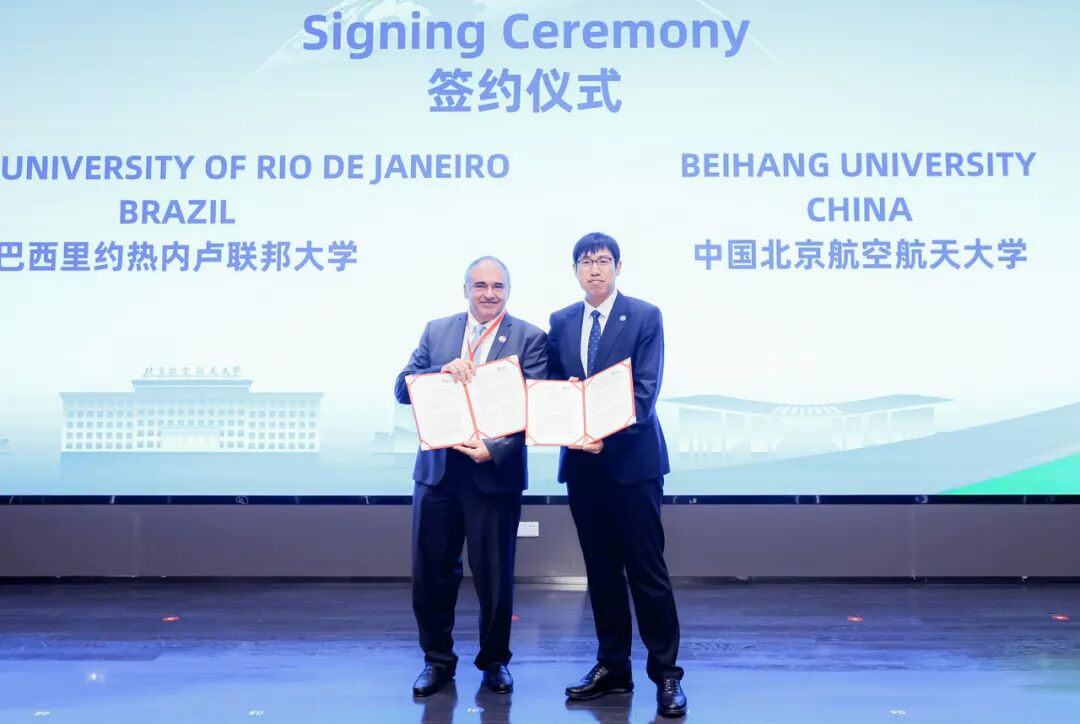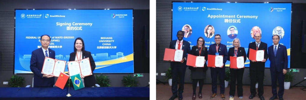 北航校长助理、杭州国际创新研究院院长董卓宁代表北航国新院与巴西南马托格罗索联邦大学签约,并为巴西知名学者颁发访问教授聘书
