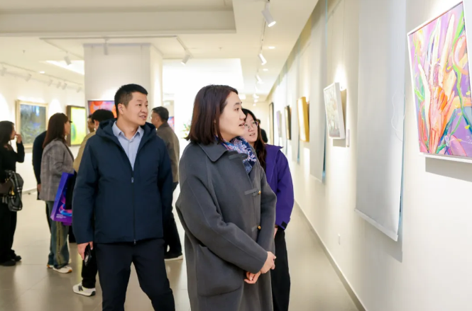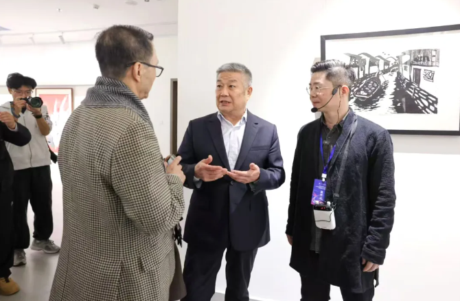 开幕式后,与会领导嘉宾共同参观艺术馆,对特藏精品展和数字艺术展纷纷给予高度评价。参观过程中,赵长禄与在场艺术家深入交流,亲切询问捐赠艺术家代表、新媒体艺术与设计学院校友姜维的近况,勉励他继续努力、取得更高艺术成就。