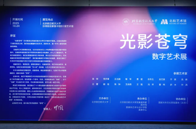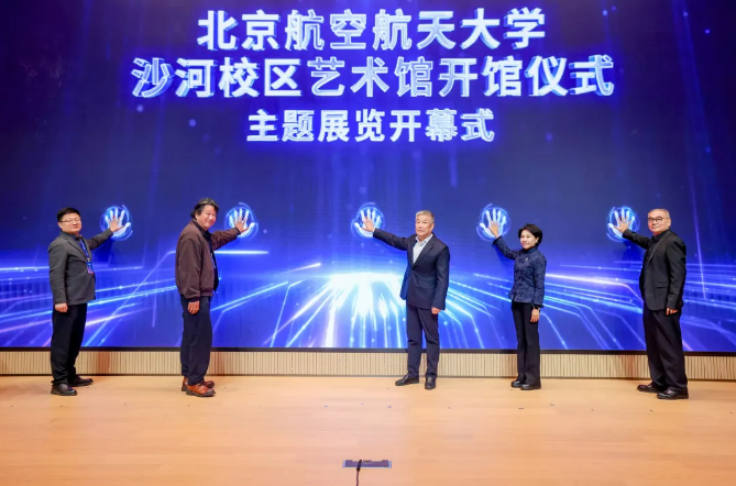 开幕式上,北航党委书记赵长禄,国家版本馆党委委员、副馆长李英,北航新媒体艺术与设计学院院长沈旭昆,中国国家画院原副院长张江舟,中国传媒大学动画与数字艺术学院院长王雷共同按下启动键,北航沙河校区艺术馆正式开馆,“丹青绘盛世,笔墨启新篇”特藏精品展、“光影苍穹”数字艺术展两个主题展览正式开幕。