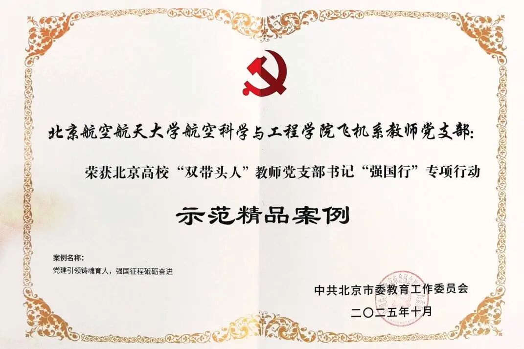 航空科学与工程学院飞机系教师党支部是北航历史最悠久、最具航空航天特色的党支部之一,参与国家几乎所有飞行器设计研制,2018年入选教育部首批“全国党建工作样板支部”,2024年入选全国高校“双带头人”教师党支部书记“强国行”专项行动团队。