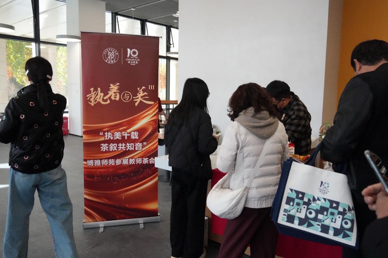 参观结束后,作为本次活动的核心环节,“执美十载,茶叙共知音”博雅师苑参展教师茶会温情启幕。现场茶香袅袅、氛围轻松热烈,教师代表们围坐一堂,围绕十年来在“博雅师苑”的学习经历、艺术成长与生活感悟畅所欲言。
