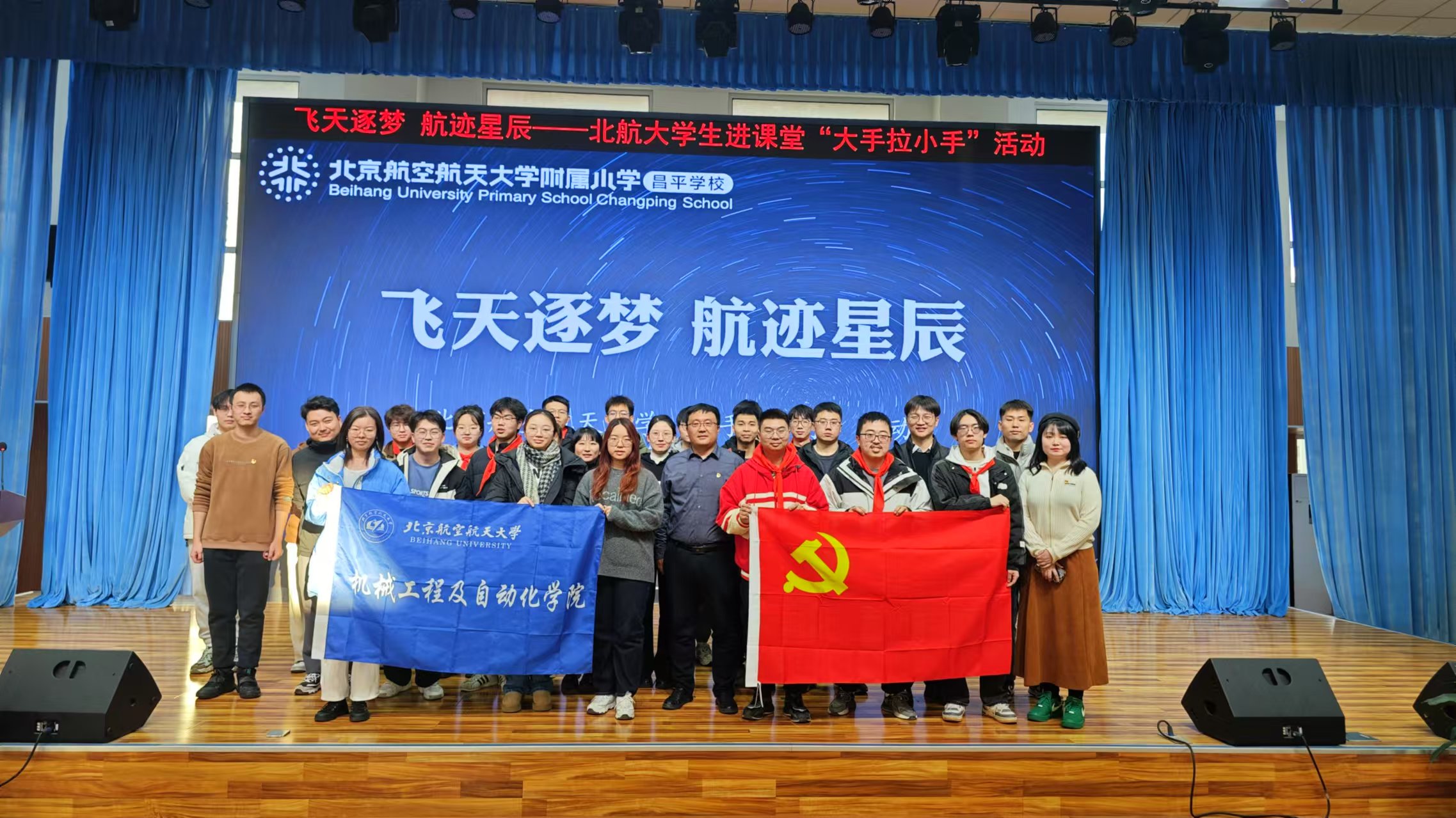 “大手拉小手”——在基础教育中播种科学梦想。学院将思政育人链条向前延伸,通过“大手拉小手”项目开展大中小学思政育人一体化实践。2024年12月,机械学院40余名学生党员受聘为北航附小昌平学校校外辅导员,围绕智能制造、机器人、航空航天等主题设计科普课程,在“小航家”心中播种“制造强国”的种子。该项目自2004年启动以来,已累计组织800余名学生党员参与,覆盖小学生超14000人次,成为制造强国人才培养体系中的重要启蒙环节。
