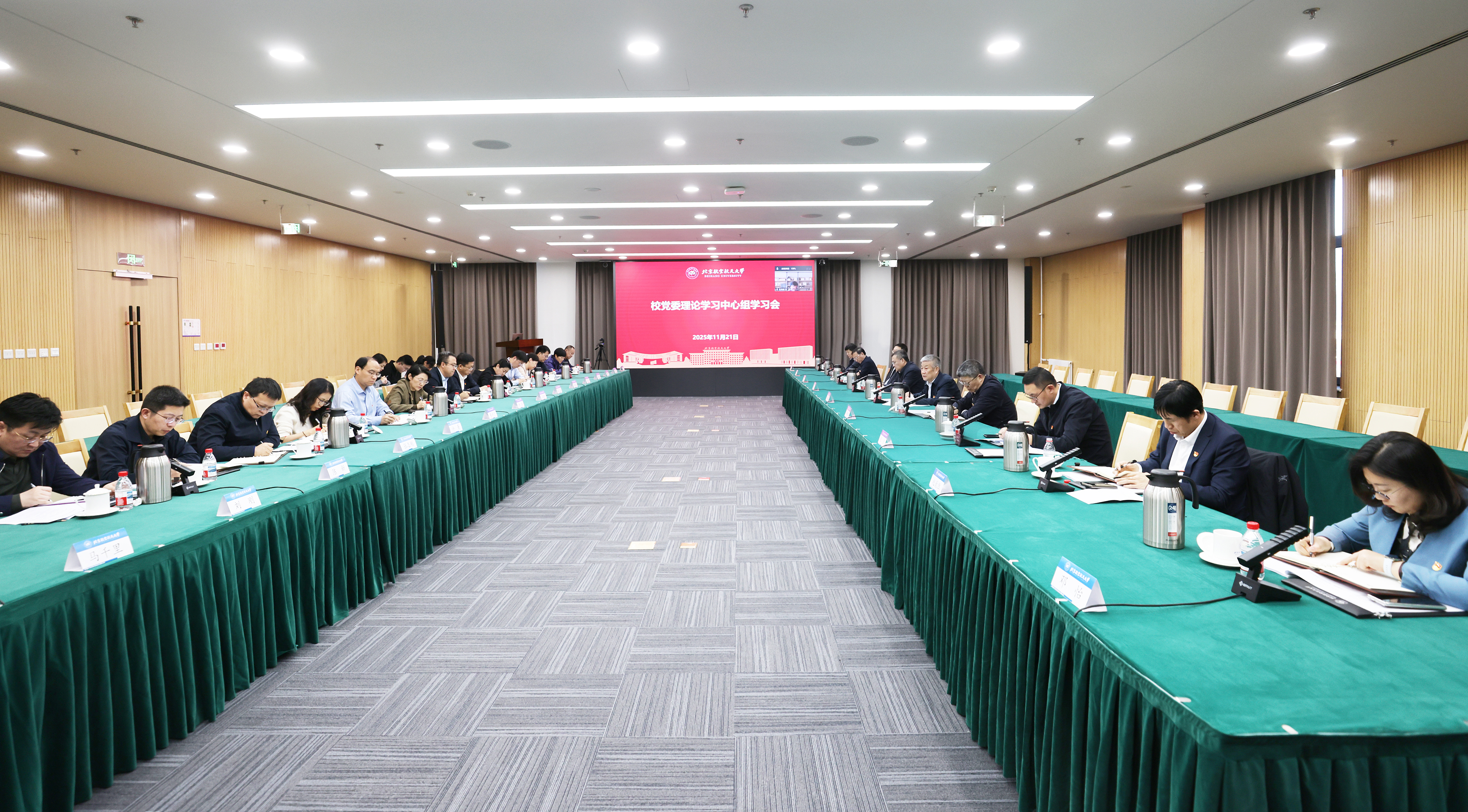 北航新闻网11月21日电(记者 张大伟 祁文/文 邸白鹭/摄影)11月21日,北航在沙河校区八号楼1301会议室召开校党委理论学习中心组学习会,深入学习领会习近平文化思想,一体学习研究思想政治、意识形态、统一战线、民族宗教、安全稳定等内容。党委书记赵长禄主持会议。