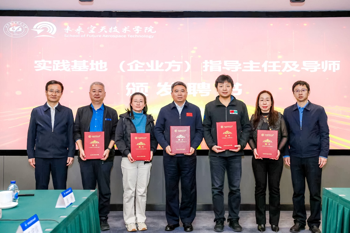 未来空天技术学院副院长韩钰、卫星应用创新院智能系统所副所长潘博分别介绍了双方情况。未来空天技术学院常务副院长曹庆华与中国卫通人力资源部部长薛浩洁代表双方签署合作协议。随后,吴江浩与马海全为人才培养实践基地企业方指导主任薛浩洁和企业导师史文华、朱兴鸿、田志新、姚怡颁发聘书。