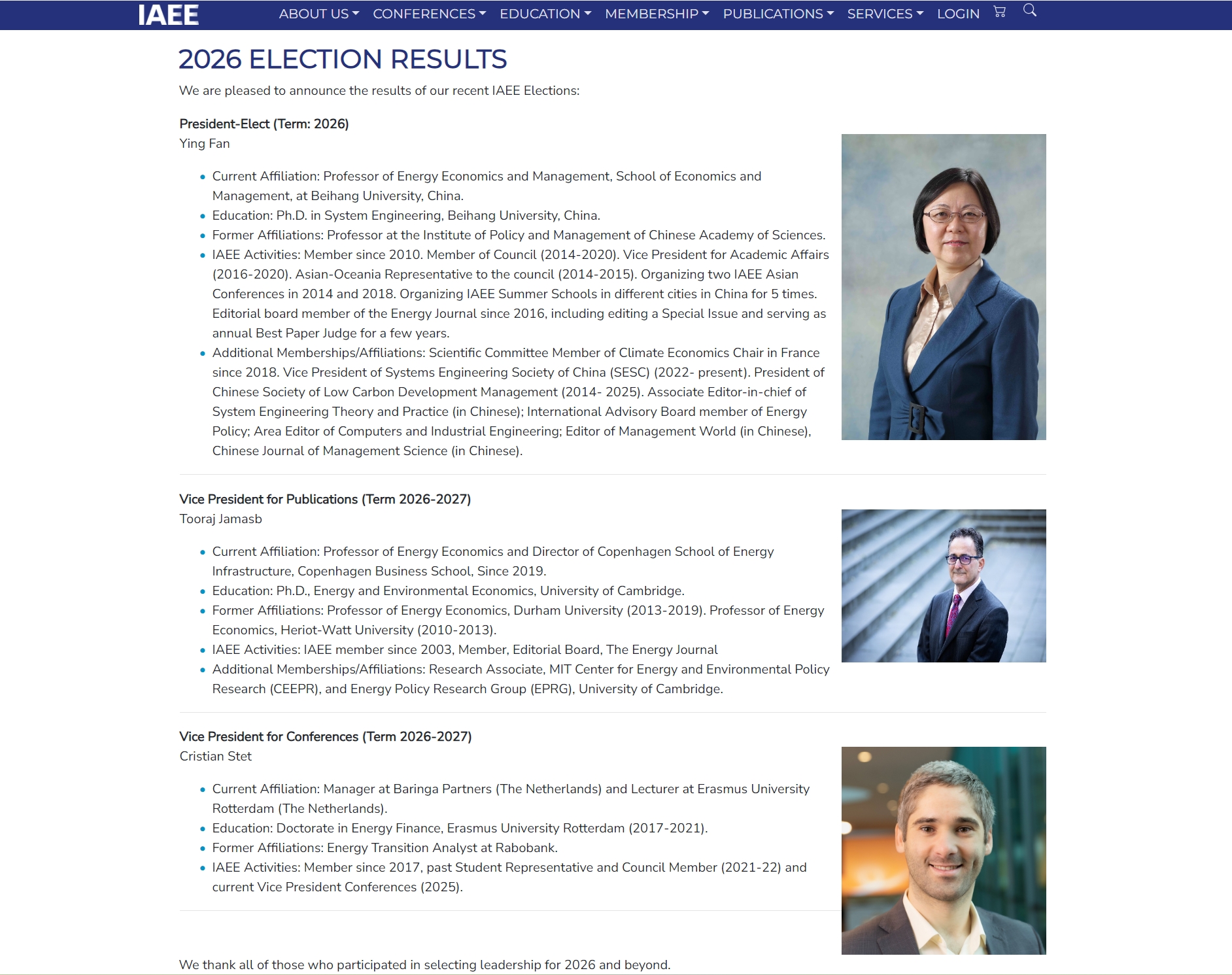 此次当选是iaee历史上首次由华人担任主席一职,选举结果不仅体现了能源经济领域同行学者对范英教授学术水平、国际影响力和杰出领导力的认可,而且标志着中国能源经济领域的学术研究和中国的能源经济学家在国际学术共同体获得了重要的地位。