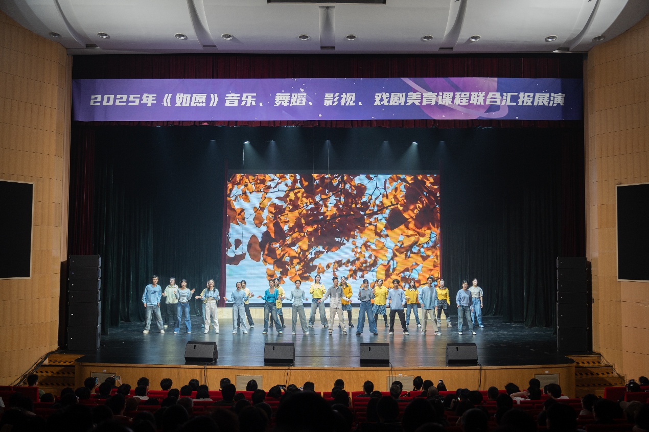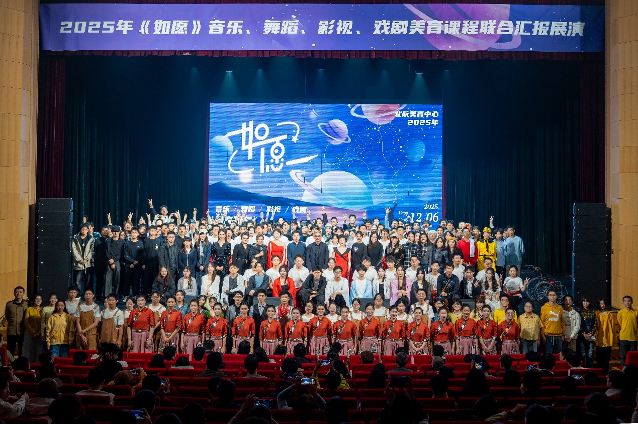 北航新闻网12月10日电(通讯员 高蕊)为深入贯彻习近平总书记关于美育工作的重要指示精神,落实五育并举人才培养战略,践行学校《美育工作实施方案》“四个一”美育培养理念,推动课堂教学与美育实践深度融合,12月6日晚,由北京航空航天大学美育中心主办的2025年音乐、舞蹈、影视、戏剧美育课程联合汇报展演《如愿》在学院路校区晨兴音乐厅上演。本次展演延续过往两年的“如愿”主题,汇集了美育中心12位教师精心开设的13门课程成果,234名师生携手登台,以多元艺术形式呈现美育育人成效。新媒体艺术与设计学院及美育中心相关负责人出席活动,与现场观众共同见证这场艺术盛宴。