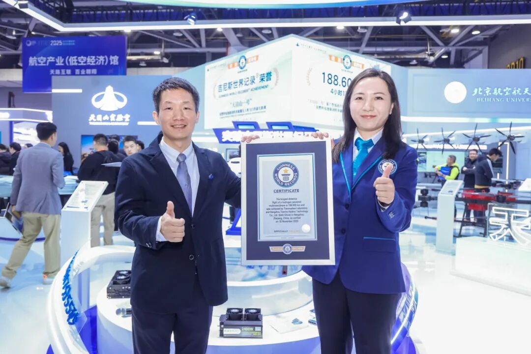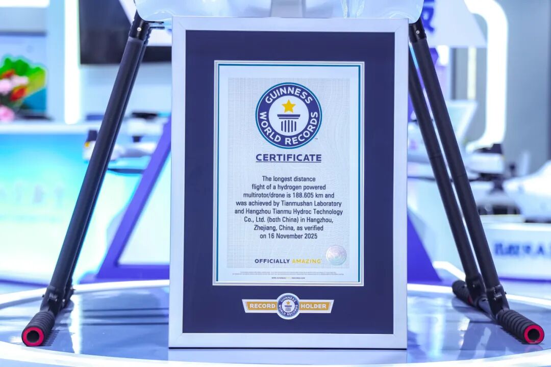 北航新闻网12月11日电(航宣)2025年12月11日上午,在第七届浙江国际智慧交通产业博览会上,吉尼斯世界纪录(guinness world records)官方认证官宣布,“天目山一号”无人机(量产型)创造了“氢燃料电池驱动的多旋翼无人机飞行的最长距离”世界纪录。