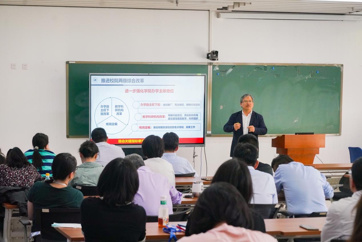 院长韩德仁做专题报告,传达解读了学校2024人才培养大会主要精神,结合学院实际情况,从课程建设、教材建设、专业发展、数智赋能、师资队伍建设等方面,深入剖析学院人才培养工作的短板和不足,指出学院本年度人才培养的重点工作。报告强调提高人才培养质量是提升办学质量的关键,要求全院教职工坚定信心,主动求变,为进一步提高学院人才培养质量而共同努力。
