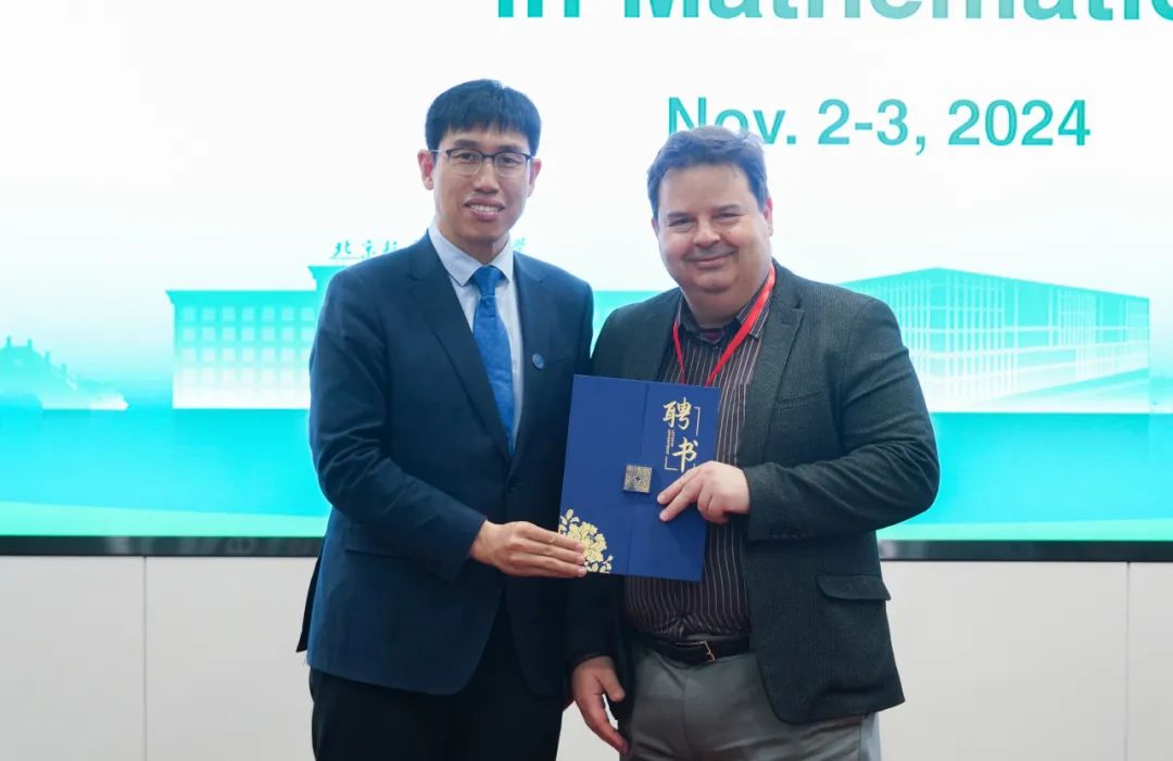 副校长赵巍胜出席研讨会,代表学校对国内外专家的到来表示热烈欢迎,并为顶尖期刊主编iliaskotsireas教授颁发中法数学实验室学术顾问专家聘书。