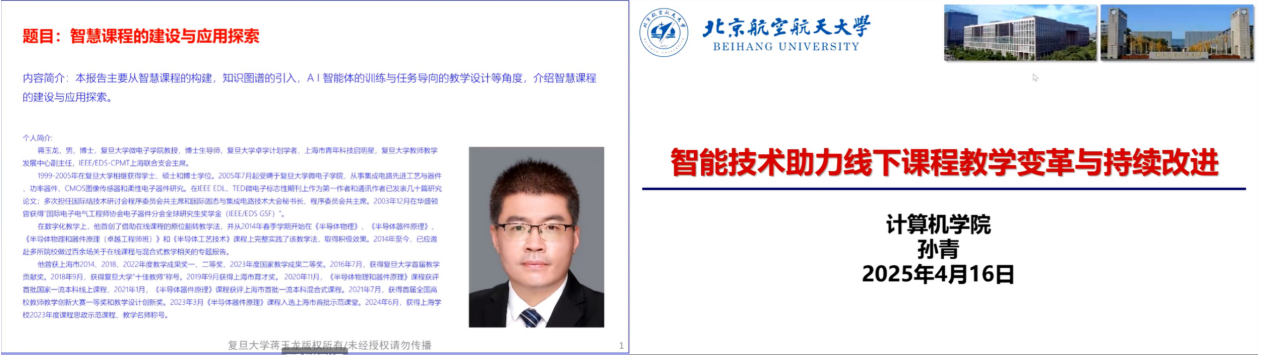 4月16日,第六讲由复旦大学微电子学院教授蒋玉龙为参会教师带来题目为《智慧课程的建设与应用探索》的主题培训。他表示ai对智慧课程的建设与数字化资源的获取提供了更多的便利性,在数字人、数字化平台的辅助下,通过混合式教学、翻转教学的等模式,让智慧课程起到正向赋能的作用,帮助学生高质量地学习和巩固。北京航空航天大学计算机学院副教授孙青带来主题培训《智能技术助力线下课程教学变革与持续改进》,她从公共必修基础课课程目标出发,介绍了对智能答疑系统的对接、训练、测试,并通过检索增强技术优化大模型效果的整个过程。从而让ai赋能教学,促使教学过程从“学知识”向“强思维、重能力”转变。