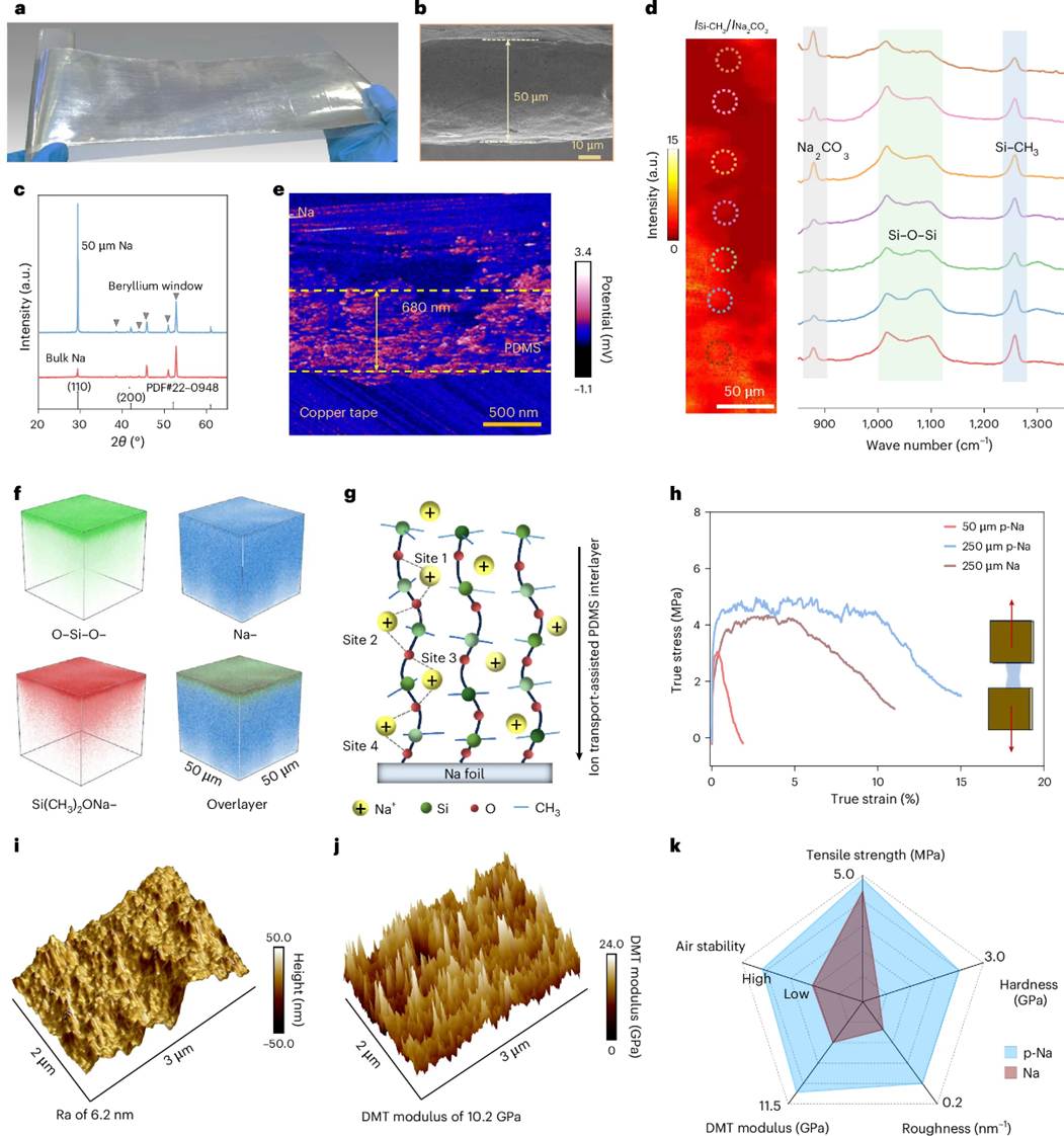 研究发现pdms通过na-o-si键成功“嫁接”于钠金属表面,实现了对钠金属界面改性。与纯钠金属相比,p-na箔的硬度提升8倍,抗拉强度增强,表面粗糙度降低,dmt模量明显提高,且空气稳定性显著改善。这表明该超薄钠箔兼具优异的力学性能与结构稳定性,可有效适配钠基电池的应用需求。(图2)。