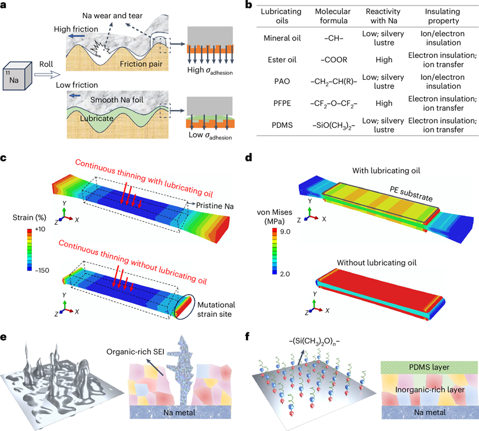鉴于此,该研究提出界面润滑与功能改性协同策略,以自润滑聚二甲基硅氧烷(pdms)为多功能添加剂,在轧制过程中既能形成表面润滑膜,又能在钠金属表面构建机械稳固的界面层,从而实现大面积、超薄(≤50 μm)且机械强度增强钠箔的可控制备(图1)。