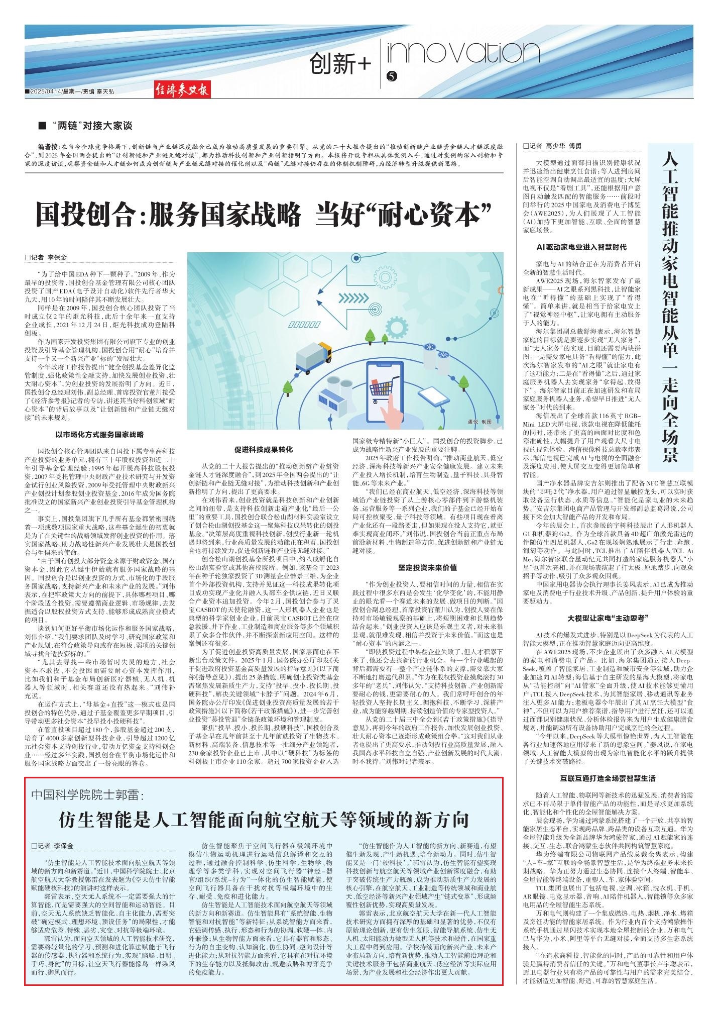 “仿生智能作为人工智能的新方向、新赛道,有望催生新发现、产生新机遇、培育新动力。同时,仿生智能又是一门‘硬科技’。”郭雷认为,仿生智能有望实现科技创新与航空航天等领域产业创新深度融合,有助于突破传统生产力瓶颈,成为推动新质生产力发展的核心引擎,在航空航天、工业制造等传统领域和商业航天、低空经济等新兴产业领域产生“链式变革”、形成颠覆性创新优势,实现高质量发展。