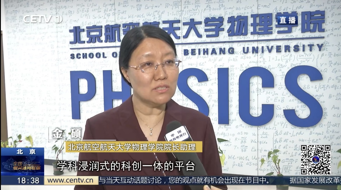 【同期】北京航空航天大学物理学院院长助理 金硕:经过我们这么多年的实践,我们现在的孩子们实际上拥有非常坚厚的数理基础,基于我们学院的九大学科平台,我们建设了非常好的学科浸润式的科创一体的平台。那么学生在一边学习专业知识的同时,也对于整个的我们国际的物理学的学科前沿以及国家的重大战略需求有了非常好的了解。