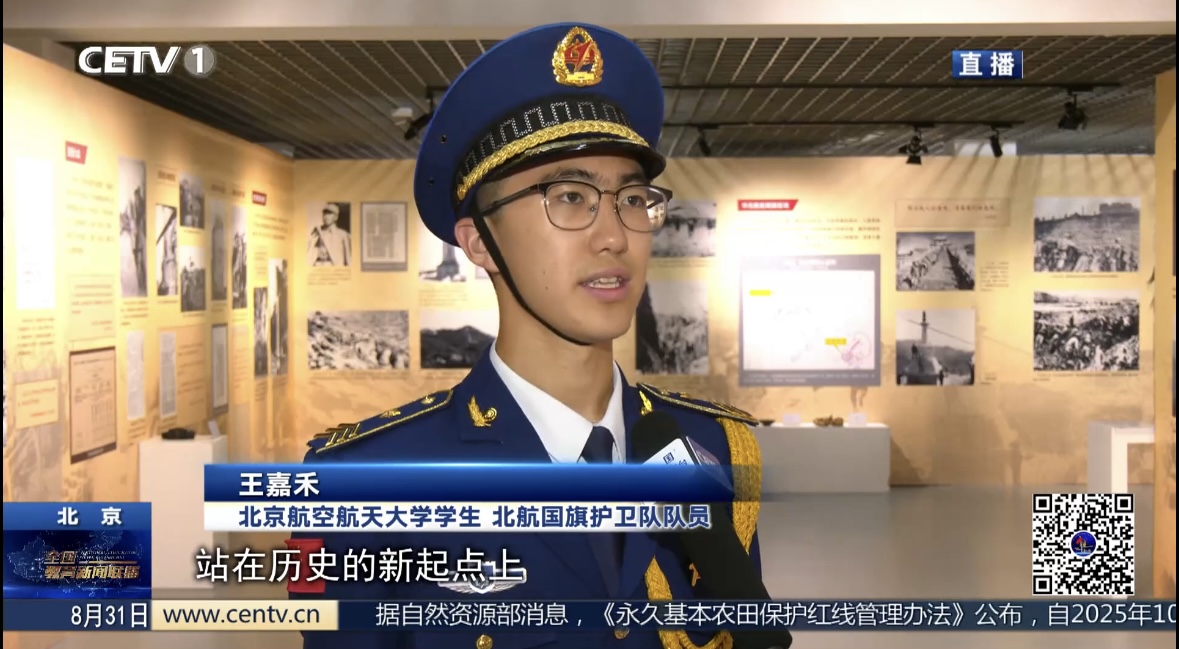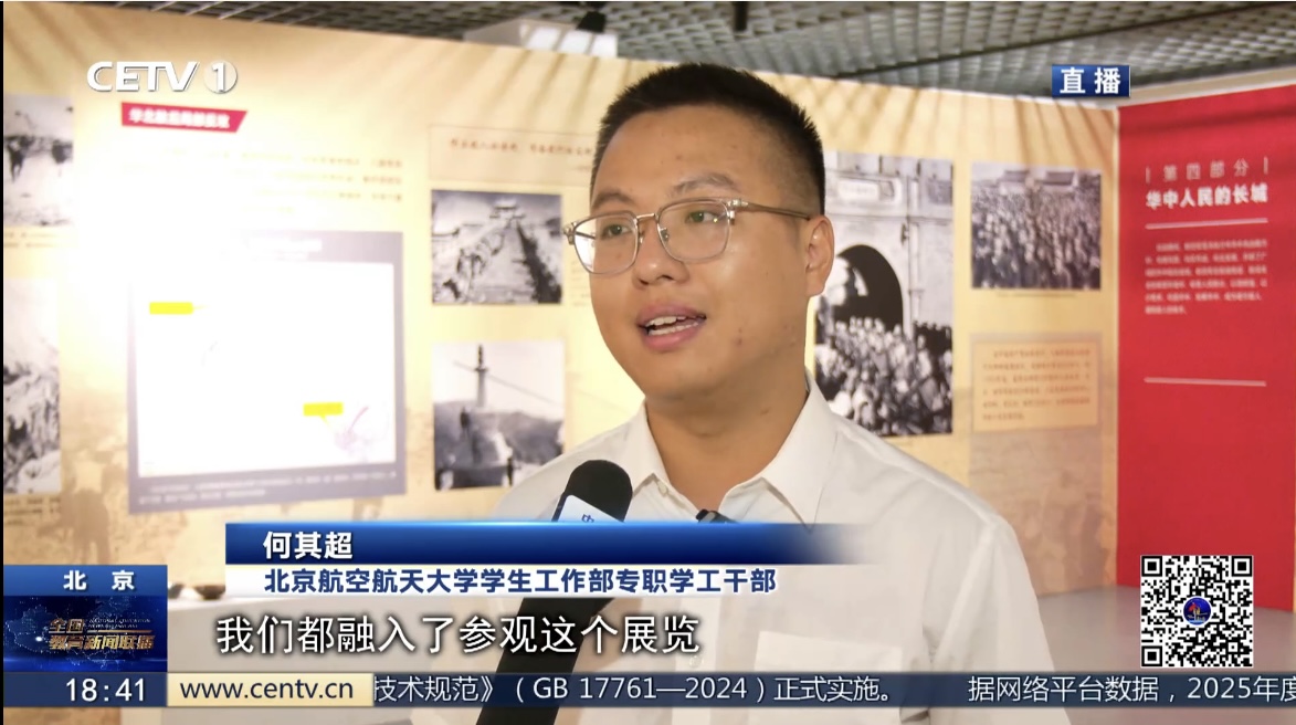 【同期】北京航空航天大学学生工作部专职学工干部 何其超:在新生第一课、新生军训,我们都融入了参观这个展览,我们希望在新生入学教育的阶段,给同学们浸润式地开展纪念抗战胜利80周年这样一个活动的这样一个精神的学习。