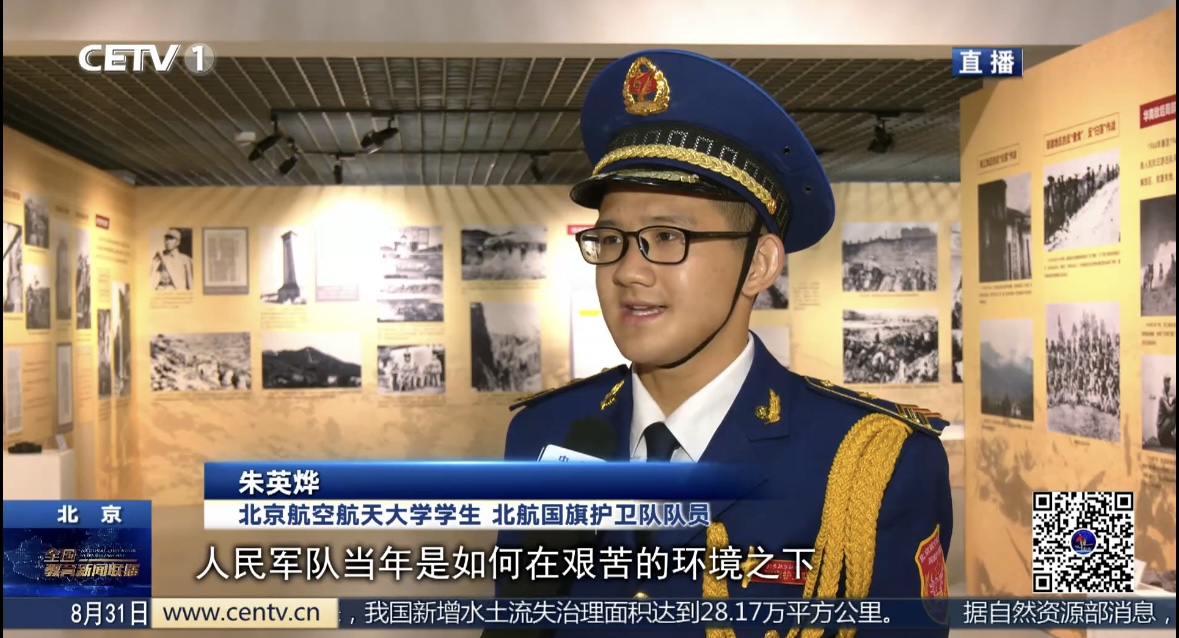【同期】北京航空航天大学学生 北航国旗护卫队队员 朱英烨:更深刻地了解到了人民军队当年是如何在艰苦的环境之下,仍然坚持着抗战,这种精神值得我们学习。