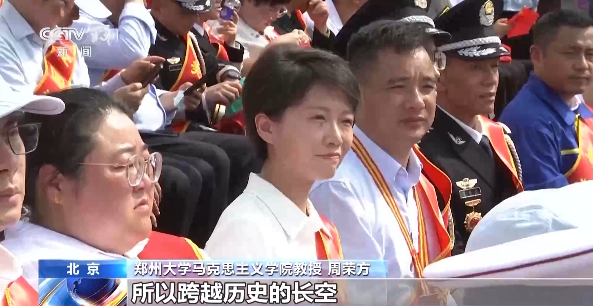 郑州大学马克思主义学院教授 周荣方:聆听习近平总书记的重要讲话特别振奋。他提到消弭战争根源、不让历史悲剧重演,让人振聋发聩。作为思政课教师、青年的引路人,我们要如何让青年践行这份责任。80年前,中国处于一个战乱频仍的时代,那个时候什么能成为中流砥柱,是把人民汇聚起来的力量。80年后,中国国富民强,又是什么力量能够引领我们走向民族复兴,是人民至上的力量。所以跨越历史长空,我一直在感受着中国共产党的强大魅力。