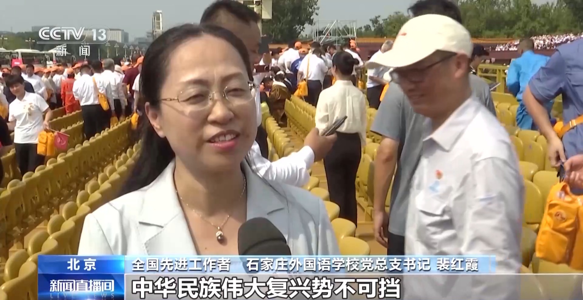 全国先进工作者 石家庄外国语学校党总支书记 裴红霞:总书记在讲话中指出,中华民族伟大复兴势不可挡,人类和平与发展的崇高事业必将胜利。这句话给我留下了深刻的印象,这是历史的回响,更是未来的召唤。作为一名教育工作者,我深感责任重大,我们将牢记总书记的嘱托,把伟大的抗战精神弘扬传承下去,激励我们广大师生,将个人理想与国家发展和富强紧密结合起来,为我们中华民族伟大复兴而奋斗。