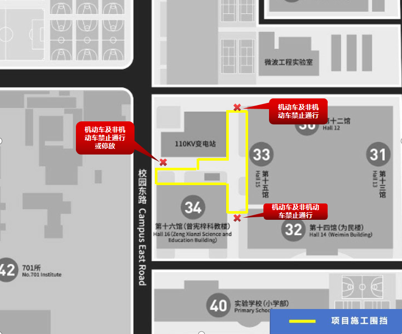 根据学校统一规划,综合考虑充电桩迁移及第十五馆西侧新能源车辆停车场项目建设需要,为保障通行安全,自2025年4月23日10:00起,第十五馆周边部分路段需要封闭并搭设施工围挡,变电站南侧围挡外仅允许行人通行,机动车及非机动车禁止通行/停放,详见附图。