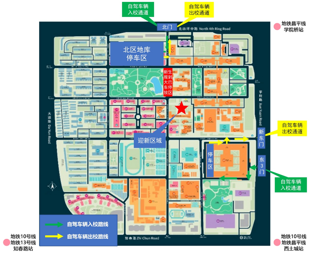 2.新生报到自驾车辆由东3门、北门入校,由新东门或北门出校。东3门进入的新生报到自驾车辆,沿新主楼内环向南围绕新主楼驶入新主楼西侧临时停车区依次顺序停放,车头向北,请配合现场人员指挥,由新东门出校。北门进校车辆进入北区地库停放,北区地库东口驶出的车辆由北门出校。